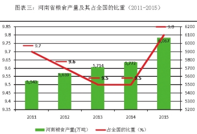 图三:河南粮食产量及其占全国的比重(2011—2015)