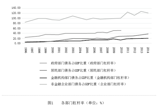 我国各部门杠杆率水平不相同,高杠杆主要体现在工业企业(图1,P40)。非金融企业杠杆率在2010年之前还较为平稳,在2010年出现了快速上升。居民和政府的杠杆率都较低,但是从2008年开始了快速上升。