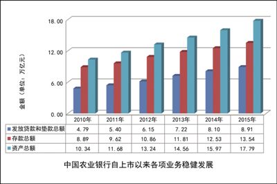 截至2016年3月底,农行总资产达到18.4万亿元,各项存款余额14.4万亿元,各项贷款余额9.3万亿元;市值在国内银行业排名第三位,世界排名第五位;一级资本在全球1000家银行排名第五位,在世界500强中排名第三十六位,2014、2015年连续两年入选全球系统重要性银行。县域“三农”贷款2.98万亿元,占全行贷款余额的1/3;在832个扶贫重点县的贷款余额达6198亿元,较年初增加291亿元;国家级、省级龙头企业服务覆盖率分别达82%和61%;支持农业大户、家庭农场、专业合作社37.45万户。