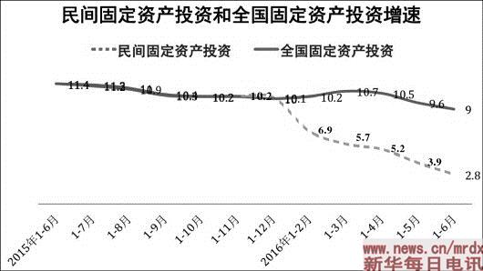 今年以来,民间投资增速急剧下降,引发社会舆论广泛关注。国家统计局上周公布,1至6月份,民间固定资产投资同比名义增长2.8%,与去年同期民间投资及今年同期全社会投资相比,降幅均已超过六成;民间固定资产投资占全国固定资产投资(不含农户)比重为61.5%,比去年同期下降3.6个百分点。