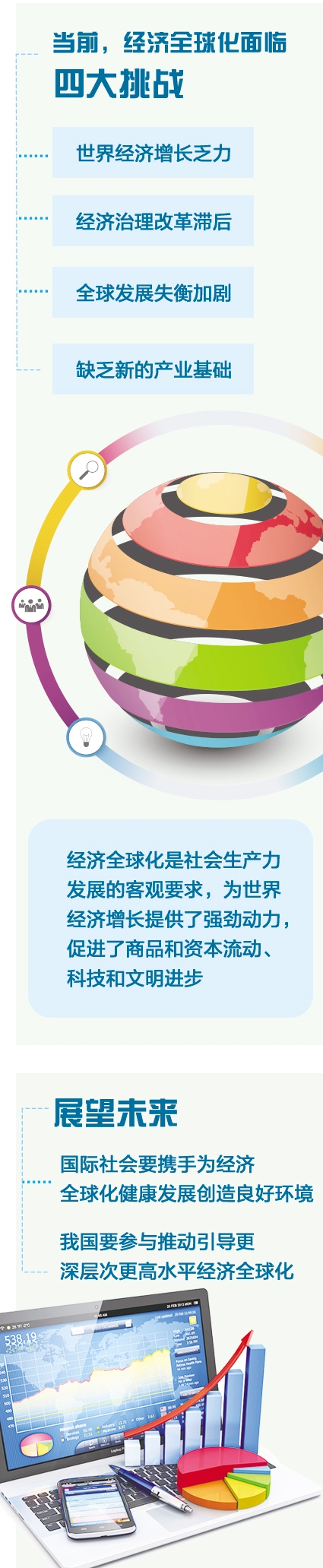 完善全球经济治理,推动经济全球化更加普惠均衡。要正视经济全球化进程中出现的问题,通过打造合理有效的全球经济治理模式,矫正经济全球化进程中的市场失灵,加大国际公共品供给,让经济全球化更多惠及发展中国家。