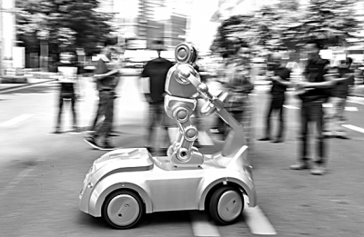 在全国大众创业万众创新活动周主会场上,参观者被一款安防机器人吸引。新华社发