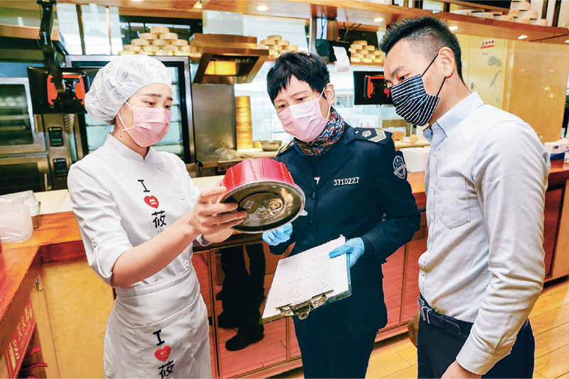 受疫情冲击,众多企业和个体工商户生产经营困难加大,要积极协助企业解决经营中遇到的问题,为复工复产创造良好环境。图为2020年2月5日,山东省青岛市崂山区麦岛市场监管所执法人员对一家餐饮企业包装餐具进行检查,确保餐饮行业安全有序复工。 中新社记者 解豪/摄