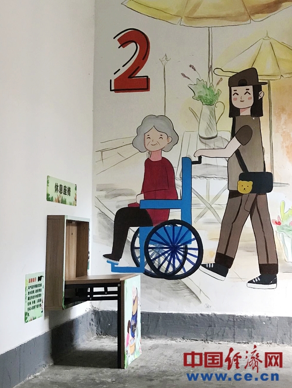 楼道里除了精美的手绘墙,还有增添的楼梯扶手,每层楼都放置的休息座椅……无处不体现了微治理的精巧。