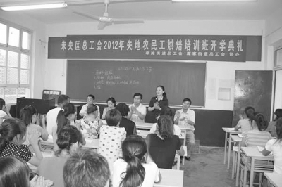 在城中村改造过程中,失房失地后如何安排就业成为失地农民的主要利益诉求之一,而建立健全失地农民职业技能培训体系则是政府应承担的责任。图为西安市未央区总工会2012年失地农民工烘焙培训班开学典礼现场。资料图片