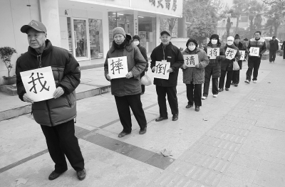2013年12月26日,郑州市建设路小广场上,十几位老人一字排开,每人手中举起一个字牌,用行为艺术的方式呼吁大家互相帮助,呼吁爱的回归。CFP