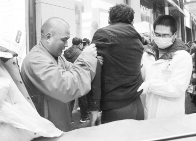 1月8日,浙江金华一名男子在市区西市街上突然发病跌倒。附近的市民和智者寺的僧人见状立即上前救助。 CFP
