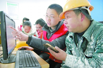 江苏大学的学生在农民工网络学堂指导农民工上网学习智能手机的功能和使用方法。石玉成摄/光明图片