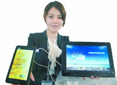 在西班牙巴塞罗那世界移动通信大会上,一名工作人员展示平板手机。新华社记者 谢海宁摄