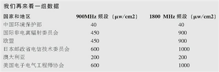 这是我国移动通信领域电磁辐射标准同其他国家标准的比较。