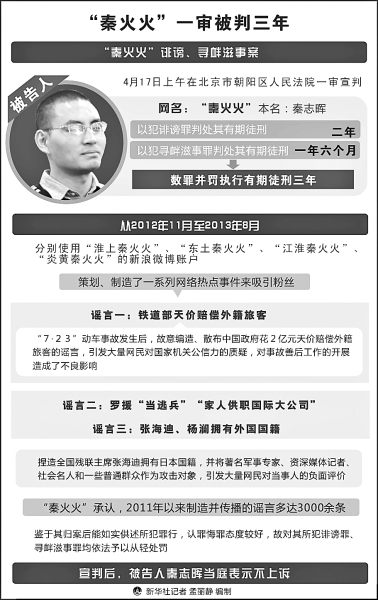 4月17日,备受关注的秦志晖(网名“秦火火”)诽谤、寻衅滋事一案在北京市朝阳区人民法院一审宣判。朝阳法院以秦志晖犯诽谤罪判处其有期徒刑两年,以秦志晖犯寻衅滋事罪判处其有期徒刑一年六个月,数罪并罚决定执行有期徒刑三年。秦志晖当庭表示不上诉。