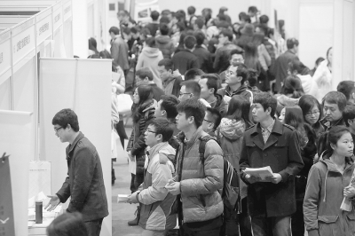 很多应届大学毕业生都希望成功求职进而在京落户。图为3月12日,“2014年北京地区毕业生就业服务月暨公共就业和人才服务进校园活动”北京林业大学专场招聘会现场。CFP