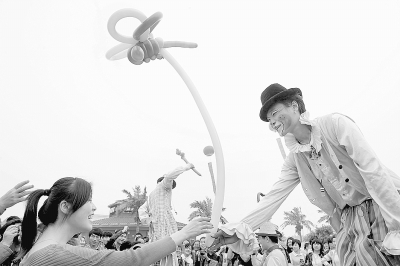 在安徽芜湖方特主题公园,小丑演员与游客互动。CFP