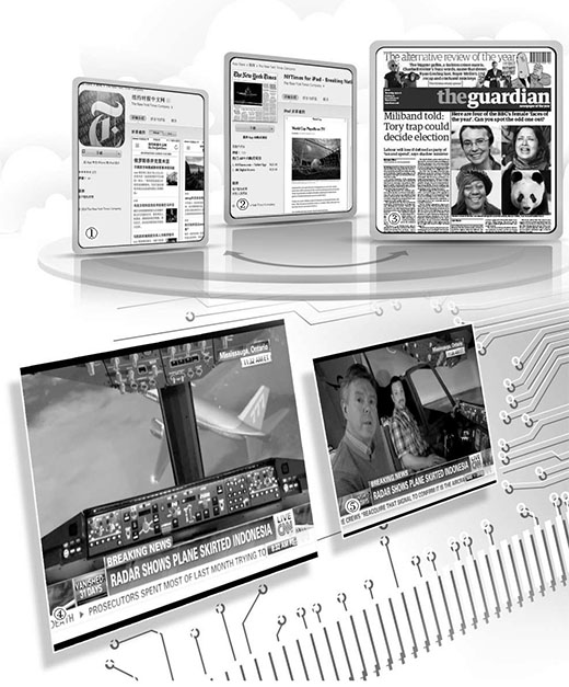 图④、图⑤:马航失联31天,美国有线电视新闻网记者在波音777模拟驾驶舱中直播采访,利用人机互动技术,使观众身临其境,印象深刻。