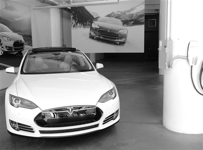 特斯拉公司在纽约市的销售展厅位于曼哈顿充满创意与活力的切尔西区,图为对外展示的特斯拉S型纯电动汽车和快速充电器。 本报驻纽约记者 张伟摄