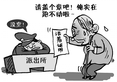 为证明“自己活着”,一村民多次赶到派出所开证明。(春鸣 作图)