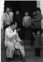 ▲1959年6月24日,毛泽东畅游湘江之后,访问橘子洲农家,同儿童逗乐。