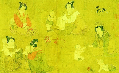 左图为宋代《妃子浴儿图》(现藏于美国大都会博物馆)