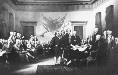 取自约翰·特朗布尔的油画《独立宣言》。画面上居中的是宣言起草委员会的5个成员,从左起他们分别是:约翰·亚当斯、罗杰·谢尔曼、罗伯特·利文斯顿、托马斯·杰斐逊、本杰明·富兰克林。资料图片