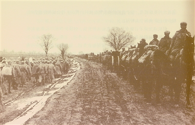 此后不久,部队又受领了围歼已被围在陈官庄34天的杜聿明集团的新任务。那天傍晚,雪花漫天飞舞,骡马拉着炮车,全团整装浩浩荡荡奔向新的战场。小道上被押向后方的俘虏队狼狈猥琐,一眼望不到头;而大道上挺进前行的我炮三团指战员则骑着高头大马,雄赳赳气昂昂。敌我气势泾渭分明。我激情澎湃,突发灵感,连忙抢到炮队前方拍下了这壮观的一瞬间。