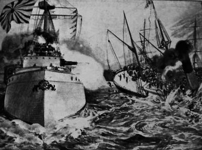 阿瑟·布朗为《东京新闻》提供的版画,描述了浪速号击沉高升号的场面,可以看到在高升号甲板上用步枪勇敢还击,宁死不屈的清军士兵。