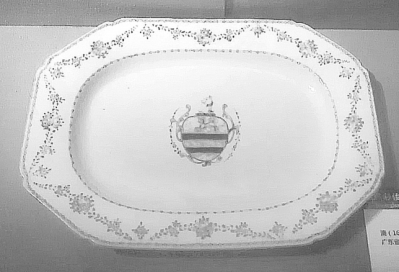 当时欧洲很多显贵的家族都以能够拥有一套中国的瓷器为荣,认为这是一件很体面的事情。订制中国瓷器,成为上流社会的一种时尚。中国南方地区的各窑口开始根据外来订单依样生产各类西方生活用瓷,其中以绘制欧洲家族徽章的纹章器和剃须盘、果盘、酒杯灯专用瓷器最为常见。“这件广彩倭角方形徽章盘(上图)就是一件典型的订制瓷。”指着一件瓷盘,蔡林介绍道,“不仅它的形状是长方形,而且在盘的中央印着一个家族的族徽。”