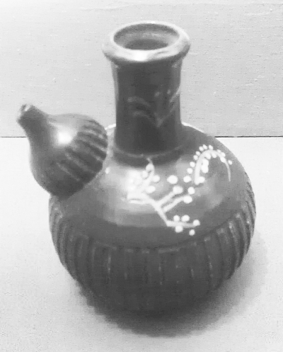 一件巧克力色的瓷器吸引了笔者的目光。它的器形很特别,貌似在花瓶上安了一个水壶嘴。说明牌上写着“漳州窑酱地白花军持(下图)”。军持是一种盛水器,为云游僧人、伊斯兰教徒盛水净手用具。“这件军持也是订制瓷,是明代时期阿拉伯风格。”讲解员说,“这个水壶嘴,学名叫‘流’,是丰满的乳房状,流尖端圆滑,显然不是中国传统的器形。”