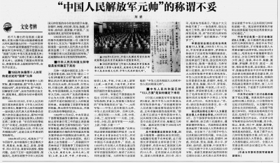 2014年1月20日的《北京日报》第19版刊登了刘岩同志的文章,《“中国人民解放军元帅”的称谓不妥》。但是,在该文中作者好像把篇幅更集中在共和国元帅人选的选定上,提出了很多有价值的史实,似乎对“中国人民解放军元帅”称谓和“中华人民共和国元帅”的区别,并没有从法律层面上讲清楚。这里我们谨做点补充,谈些不同意见。