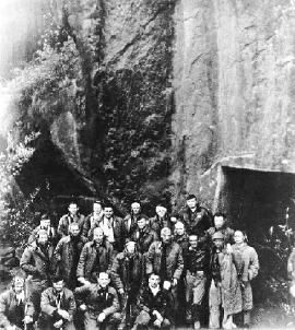这是一张抗战期间“杜立特行动”部分获救的美国飞行员在衢州汪村“石头山”空军第十三总站驻地的合影,背后的石窟就是那个曾经被美国飞行员称之为“石头防空餐厅”的石窟。