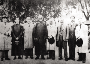 1945年,张伯苓(左四)与梅贻琦(左二)、张彭春(左三)、何廉(右三)等人合影