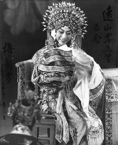 日文注释:不闻锣鼓声之声久矣,梅兰芳团长,远别日本,逾三十年。其间,三岛饱经沧海,而大陆中国拨云见天。毛泽东主席所示“百花齐放推陈出新”之伟论,亦于京剧革新中见之。