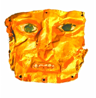 仝涛这样形容黄金面具:它尺寸不大,约4厘米见方,面部用黑色和红色的颜料勾勒出五官以及牙齿和胡须,周边有一排小孔用以缝缀在其他软质材料上,在它被发现的位置周边还出土了一些琉璃珠饰,可能与面具搭配使用。