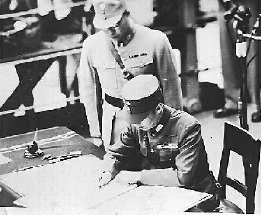 在密苏里舰上,商震(后)陪同徐永昌接受日本无条件投降