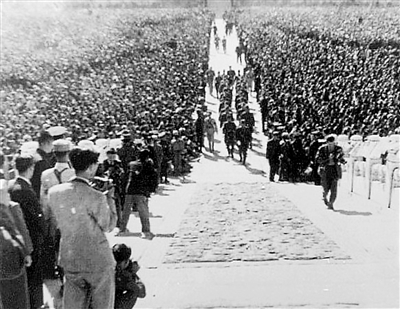 1945年10月10日,中国战区华北日军受降仪式在故宫太和殿广场举行。图为日军投降代表穿过观礼人群。当日军献刀时,群众山呼“中国万岁!中国万岁!”资料图片