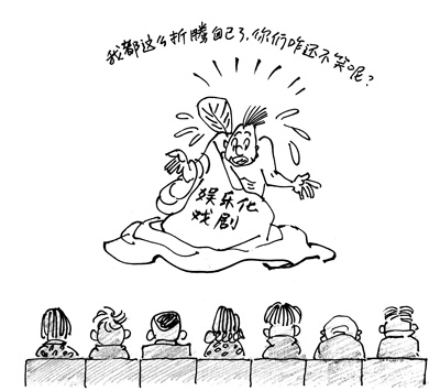 在剧作《海鸥》中,契诃夫指出,只有严肃的戏剧,才是美的戏剧。而娱乐化戏剧显然是拒绝严肃的。它披着现代性外衣,打着流行化旗帜,以对严肃问题“事不关己,高高挂起”的态度,以自我调侃和自我矮化的游戏方式,在碎片化、无厘头、无主题恶搞、无底线调笑中,实现犬儒主义的得过且过的精神胜利。娱乐化戏剧以强调剧场性为前提,拒绝文本,轻视内涵,无意对社会人生进行深刻的反思和阐释,戏剧的意识形态色彩被商品属性遮蔽,思想性和艺术性被选择性遗忘,至于文化积累和价值增长根本谈不上。发展至今的人类史表明,文化价值和终极关怀不可或缺,艺术对其不能视而不见。娱乐化戏剧显然漠视了自身的文化价值。