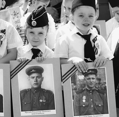5月14日,在俄罗斯顿河畔罗斯托夫,参加儿童阅兵式的孩子们手持参加二战的苏联红军士兵与退伍老战士的照片。新华社/路透