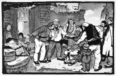 在这幅有关二流子改造的版画中,可以看到家庭叙事伦理和乡村文化传统在改造中的作用。低头悔过的二流子形象,表明改造达到了效果。(季礼)