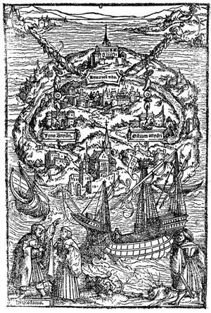 《乌托邦》讲述了一个岛国令人称奇的幸福故事。图为1518年瑞士巴塞尔印刷的《乌托邦》一书中的乌托邦岛图。