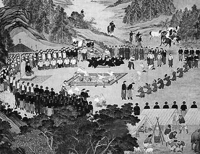 郎世宁的《塞宴四事图》(上图为局部),描绘了乾隆皇帝举行盛大宴会的场面。