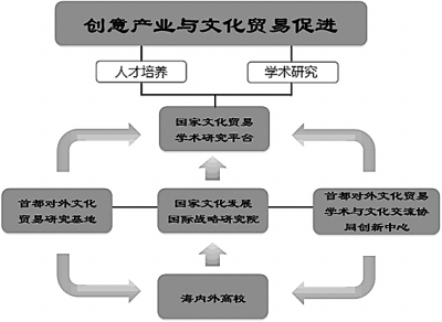 2014年,国家对外文化贸易基地(北京)正式投入运营,致力于建设成为集文化贸易口岸、协同创新平台、企业集群式发展于一体的国家级文化贸易示范区。基地以学术牵头,搭建沟通交流平台,向影视、演艺、出版等核心领域延展深化,作为综合性学术服务平台,为推动文化贸易全面发展发挥着不可替代的作用。(张彦)