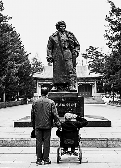 2017年3月17日,多次立下军功的英雄老兵徐振明(右)和儿子徐永军在通化市靖宇陵园向抗日民族英雄杨靖宇雕像致敬。60年来,徐振明始终守护着这座陵园。新华社记者 王昊飞摄