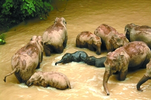 象群洗澡时小象被围在中间。