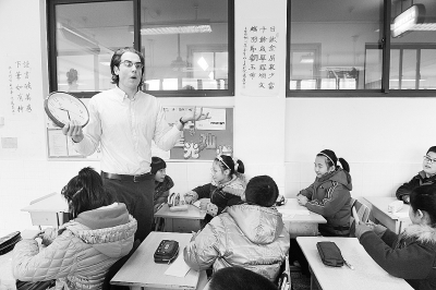 2013年2月19日,上海市江苏路第五小学,一名外籍教师在与学生们做互动游戏。CFP