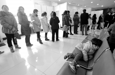 近日,山东省济南市青少年宫,孩子靠在椅子上睡着了,而众多家长拿着招生简章、排着长队等候交费,提前一个多月为孩子报艺术培训班。 CFP供图