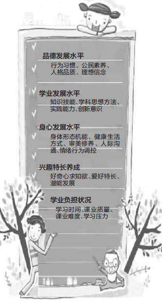 《中小学教育质量综合评价指标框架(试行)》,把学生品德发展水平、学业发展水平、身心发展水平、兴趣特长养成、学业负担状况5个方面20个关键性指标作为评价学校教育质量的主要内容。指标框架经反复研究论证,我们力求用这些指标反映每个方面评价内容,同时又能够针对当前中小学教育中存在的突出问题和薄弱环节,解决我们面临的实际问题。