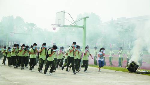 浙江省江山市贺村镇初级中学初一5班在组织防生化演练。