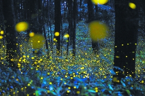 ▲ 用延时摄影技术捕捉的夏夜森林中的萤火虫照片。