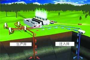 为了使冷水充分吸收花岗岩的热量,就需要增加水渗入花岗岩缝隙的程度。虽然地下花岗岩非常坚硬,但也有裂纹。钻井后要用150个大气压力的高压水,从井口灌入,迫使高压水进入岩石裂纹,增大裂纹开口。