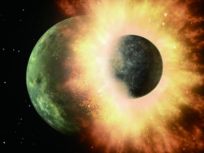 有关月球的形成,目前的主流观点是:在地球历史的早期阶段,一颗火星大小的行星倾斜着撞击到地球上。撞击摧毁了那颗行星,所形成的大部分碎块以及地球的部分碎块在地球周围形成了一个盘状带,盘状带中的碎块最终结合到一起成为月球。