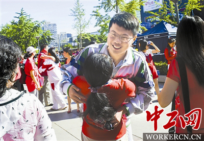 6月7日,2015年高考拉开帷幕,942万名考生奔赴考场。这是在北京人大附中考点,一名教师为其学生加油打气。 (本网记者 王伟伟 摄)